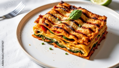 Delicious layered lasagna with rich tomato sauce fresh basil herbs melted cheese and perfectly cooked pasta on a white plate in a cozy dining setting