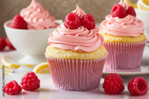 Delicious lemon cupcake with raspberry frosting, Generative AI