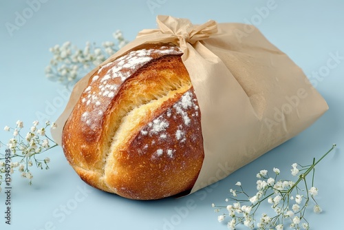 bread, loaf, wrapped, paper, beige, brown, baked, crust, flour, texture, fresh, food, bakery, artisan, gold, rustic, organic, delicious, tasty, still life, closeup, studio, detail, presentation, gift, cardboard box, simple, minimal, aesthetic, elegant, delicate, floral, bloom, blossom, white, tiny, spring, summer, soft, light, colours, background, blue, isolated, design, decorative, aromatic
