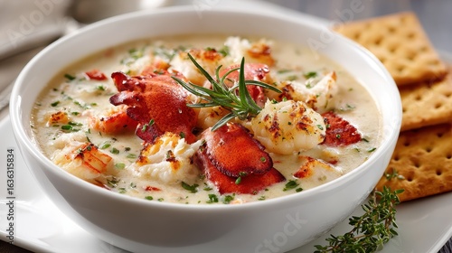 Delicious Lobster Bisque in White Bowl with Crackers and Fresh Herbs