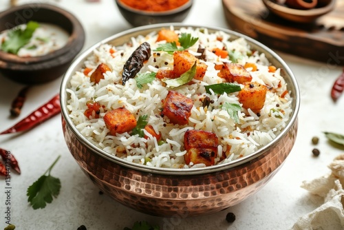 Delicious paneer fried rice in a copper bowl with spices and herbs on a white table top close up Indian cuisine food photography