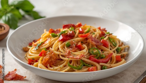 pasta, noodle, food, dish, bowl, white, red, green, pepper, texture, light, crisp, garnish, arrangement, cooked, culinary, still, life