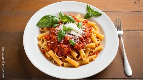 Delicious Pasta with Tomato Sauce: A Classic Italian Dish Garnished with Fresh Basil and Grated Cheese, Ready to Enjoy.