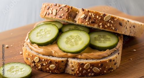sandwich, peanut, butter, cucumber, bread, whole, wheat, food, meal, snack, healthy, vegetable, slice, grain, seed, board, wooden, closeup, texture, fresh, green, round, cut, layered, widener, delicious, tasty, simple, homemade, lunch, breakfast, vegetarian, vegan, diet, nourishment, ingredient, preparation, receipe, epicure, artisan, rustic, natural, organic, surface, background, light, shadow, composition