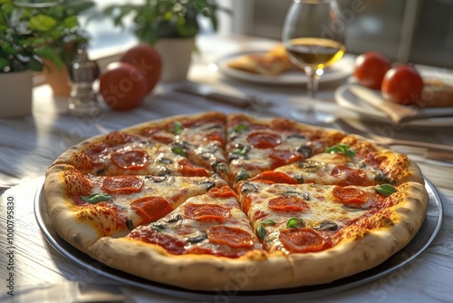pepperoni, pizza, table, delicious, rustic, wooden, cheese, dough, meal, slice, style, comfort, pepper, hunger, cookery, garlic, sauce, basil, taste, bake, oven, venue, serve, party, dinner, feast, favor, menu, epicure