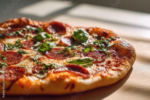 Delicious pepperoni pizza with fresh basil in sunlight.