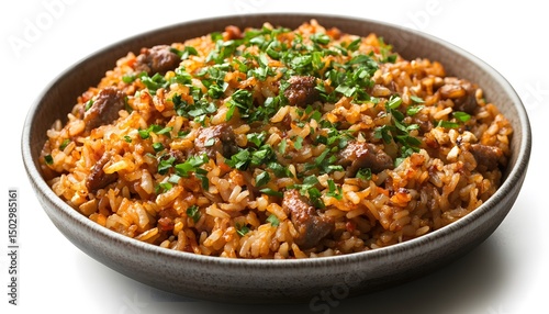 Delicious Plate of Savory Rice Dish with Fresh Herbs and Meat