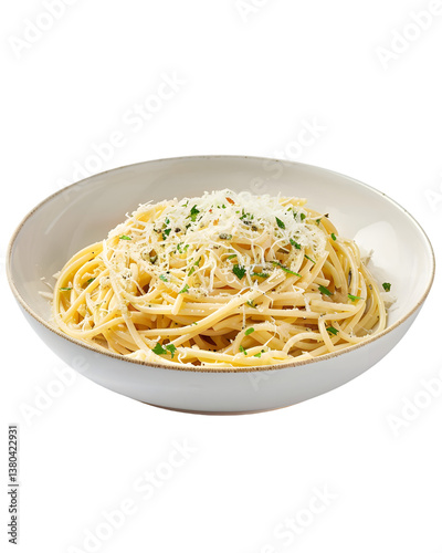Delicious plate of spaghetti with cheese and herbs served in a white bowl on a wooden table