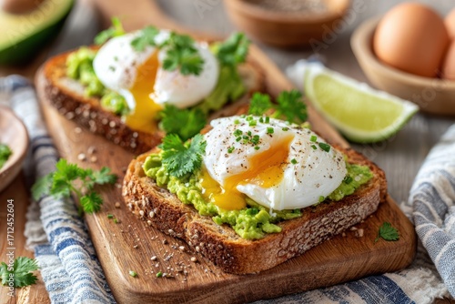 Delicious Poached Eggs on Avocado Toast with Fresh Herbs on Rustic Wooden Cutting Board Surrounded by Ingredients for a Healthy Breakfast
