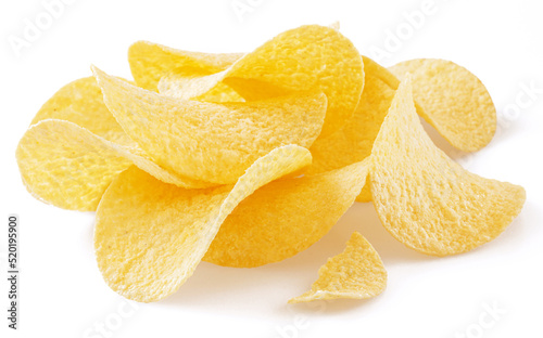 Delicious potato chips isolated on white background.