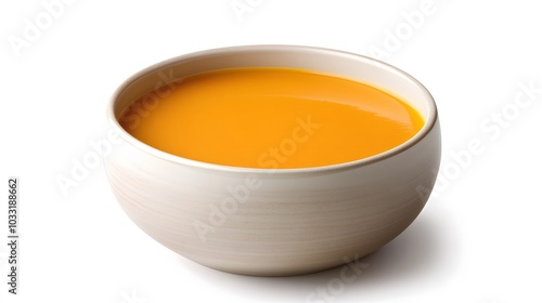 Delicious pumpkin cream soup in bowl on white background.