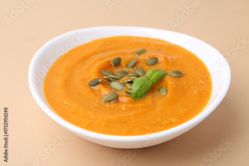 Delicious pumpkin soup with seeds and basil in bowl on beige table, closeup