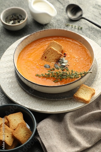 Delicious pumpkin soup with spices and croutons on grey table, closeup
