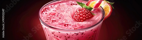 Delicious raspberry smoothie in a glass with a straw, garnished with fresh fruit on a dark background.