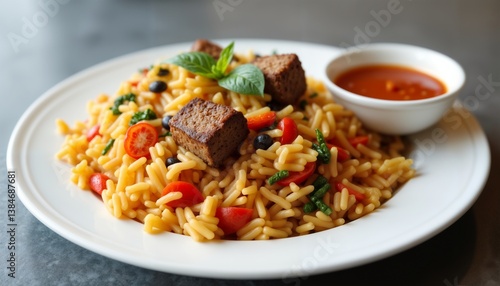 rice, meat, vegetable, sauce, dinner, meal, cooking, epicure, food, healthy, colourful, asian cuisine, italian, spicey, flavorful, home cooking, presentation, dish, garnish, herb, plate, eatery, culinary, receipe, comfort food, tasty, satisfying, wholesome, alimentary, savoury, seasoning