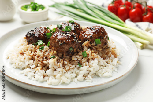 Delicious rice with meatballs, sauce and green onions on white table, closeup