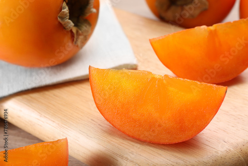 Delicious ripe persimmons on wooden board, closeup