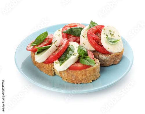 Delicious sandwiches with mozzarella cheese, tomatoes and basil isolated on white