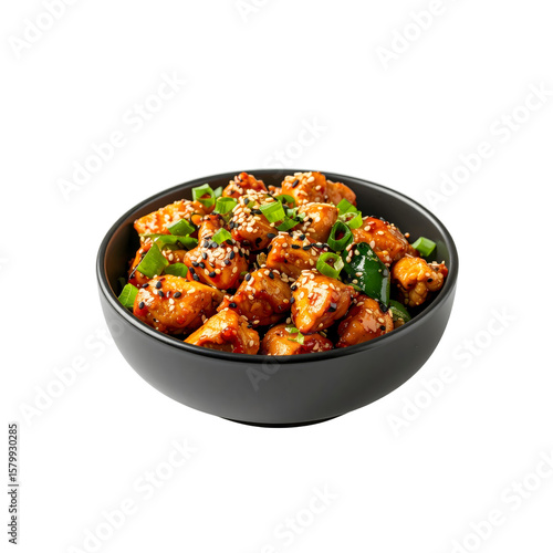 Delicious sesame chicken dish in black bowl tasty food on transparent background