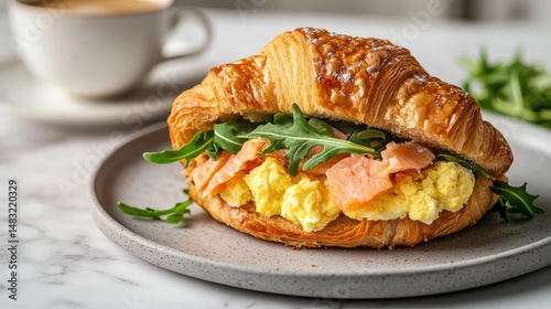 Delicious Smoked Salmon and Egg Croissant Sandwich with Arugula