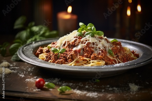 Delicious spaghetti bolognese on a rustic plate against an antique mirror background
