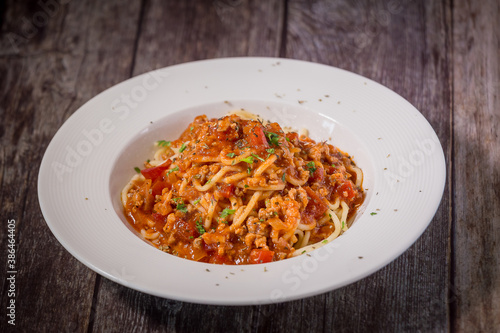 background, basil, bowl, cheese, cooked, cooking, cookery, culinary, dinner, dish, eating, food, green, herb, ingredient, italian, leaf, lunch, meal, meat, parmesan, pasta, plate, red, eatery, sauce, spaghetti, tomatoes, tomatoes, white, wooden