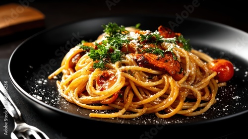 Delicious Spaghetti Served on Black Plate – Classic Italian Pasta Dish Close-Up