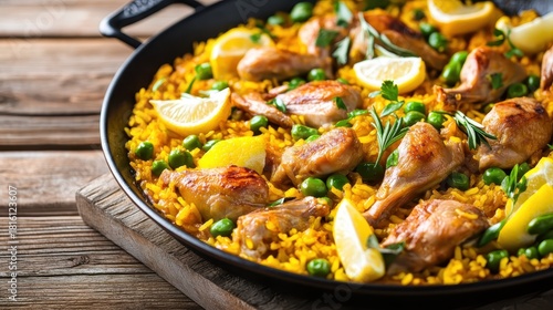 paella, food, spanish, rice, dish, rabbit, saffron, lemon, green, bean, pan, traditional, cookery, closeup, overhead, angle, warm, lighting, rustic, table, wooden, texture, meal, dinner, lunch, savoury, tasty, delicious, aromatic, yellow, pea, garnish, herb, parsley, rosemary, cooked, fried, meat, poultry, orange, serving, appetising, fresh, bright, colourful, photograph, culinary