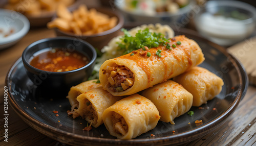 spring roll, delicious, food, black plate, herb, cookery, appetiser, savoury, meal, asian, fresh, culinary, vibrant, dish, favor, crispy, snack, vegetable, presentation, epicure, dining, ingredient, casual attire, table, eatery, eatery, flavorful, healthy, traditional, cookery, tasty, cultural, enjoyment, gathering, satisfying, indulgent, exotic, texture