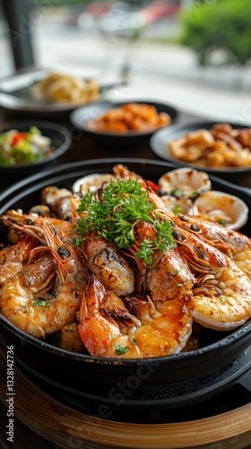 Delicious steamed seafood dishes seafood restaurant culinary photography soft lighting close-up view appetizing presentation