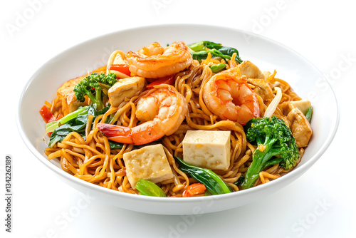 noodle, shrimp, tofu, stir fry, vegetable, broccoli, food, cookery, asian, delicious, tasty, appetising, meal, dinner, lunch, plate, white, background, healthy, protein, egg, noodle, vegetable, soy, sauce, garlic, ginger, pepper, comfort, eat, dish, epicure, eatery