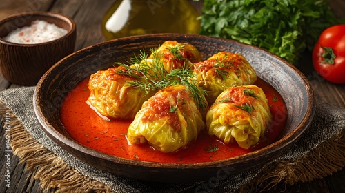 Delicious stuffed cabbage rolls in tomato sauce, a hearty dish on a wooden table, ready to eat.