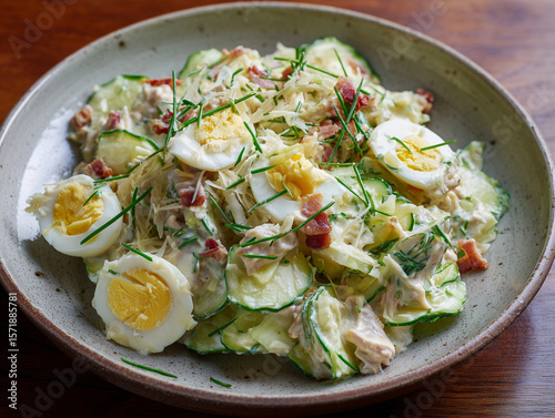 Delicious summer salad with cucumber, eggs, bacon, and parmesan