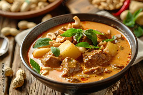 thai food, curry, basil, peanut, potato, thai cuisine, asian cuisine, delicious, flavorful, aromatic, spicey, savoury, creamy, ginger, garlic, lemongrass, authentic, traditional, homemade, dinner, lunch, food photography, closeup, macro, topview, tasty, healthy, fresh, epicure, bowl, wooden table, rustic, appetising, mouth-watering, spice