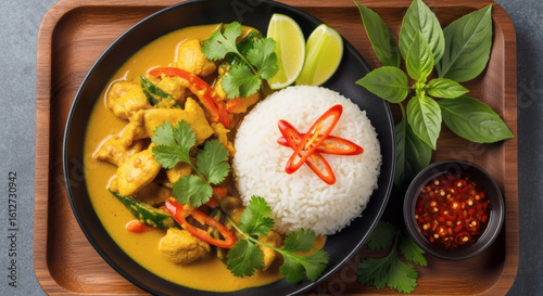 Delicious Thai green chicken curry served with steamed rice, garnished with chili, lime, and fresh herbs.