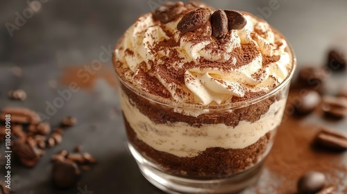 Delicious tiramisu dessert in glass, topped with whipped cream and cocoa powder. Perfect for menus, blogs, or articles about coffee-flavored treats.