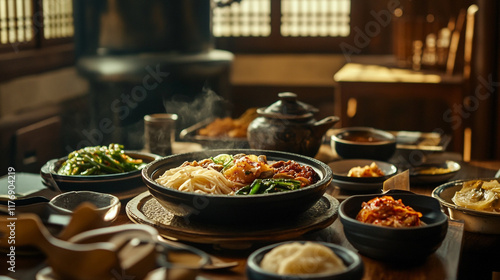 Delicious traditional meal served in a rustic dining setting with various side dishes