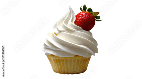 Delicious Vanilla Cupcake with Whipped Cream and Fresh Strawberry on Top