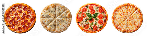 Delicious variety of fresh pizzas displayed on a transparent background, png image, graphic resources