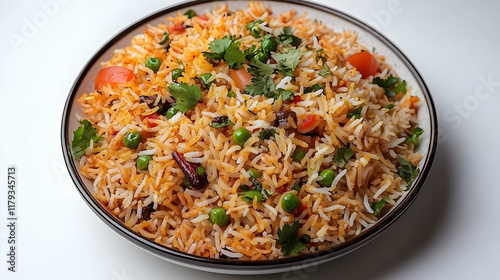 Delicious vegetable biryani rice dish in a bowl.