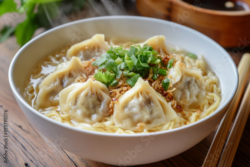 Delicious wonton noodles Soft golden yellow noodles placed in a white bowl