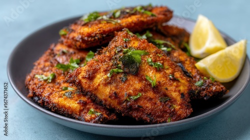 Deliciously Crispy Fish Fillets Garnished With Fresh Herbs and Lemon Wedges