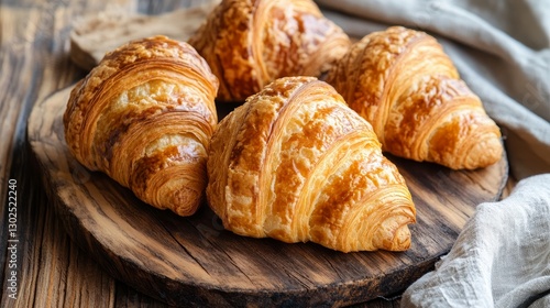 Deliciously freshly baked croissants displayed on a rustic wooden table in realistic setting