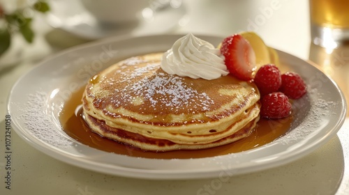 Deliciously Styled Pancakes: A Professional Food Photography Capture with Maple Syrup, Fresh Fruit, and Whipped Cream on a White Plate. Clean and Bright Composition.