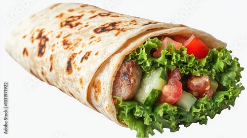 Deliciously wrapped tortilla filled with fresh vegetables and savory meat in a vibrant display of colors and textures