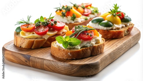 Delight in a wooden board featuring open-faced cheese canapés, perfect vegetarian tartines adorned with colorful toppings for a charming and savory presentation.
