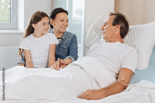 Delighted positive mother and daughter visiting their dad