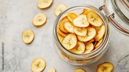 Delightful banana chips neatly arranged in a glass jar, invitingly scattered to enhance a rustic charm and emphasize their crunchy texture