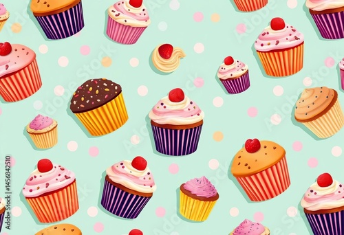 Delightful, colorful cupcake and muffin seamless pattern with polka dots, doodle, pastry