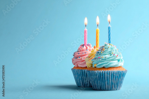 Delightful cupcakes with pastel buttercream frosting and illuminated candles